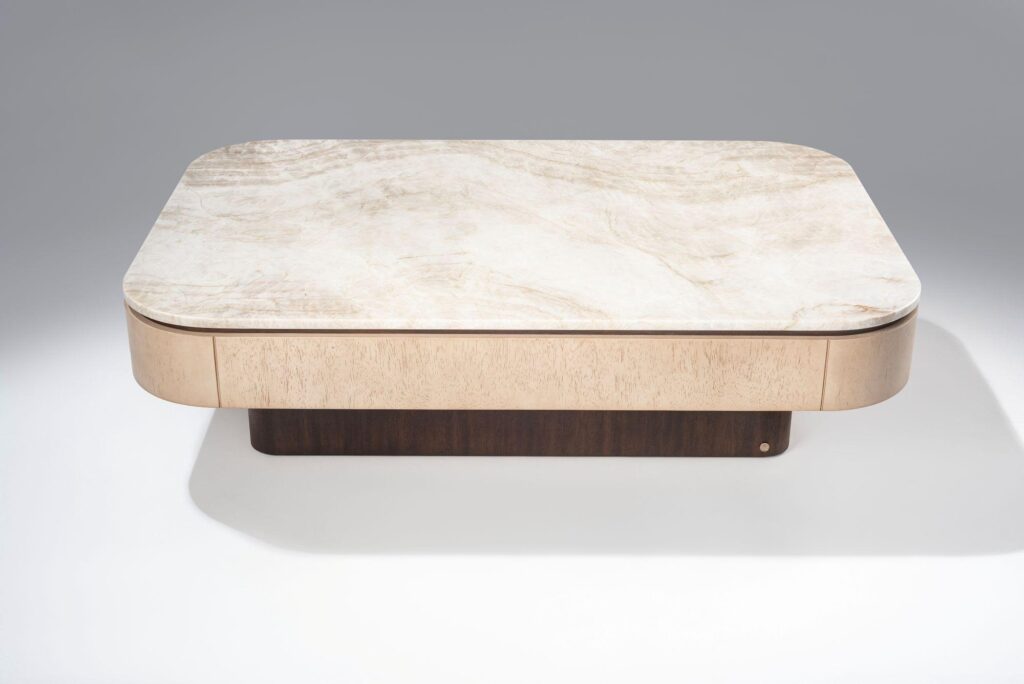 * With its roots traced to the company’s Africa cocktail table, Origen Cocktail Table 101 features a hardwood base and natural stone top.