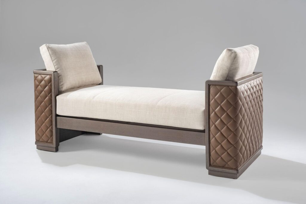 * Origen Daybed 110, ideal as a lounge or as additional seating in common areas, can be customized with fabric, quilted leather or woven raffia for the upholstery. Additional customization is available for its hardwood base. The piece was inspired by the company’s Chocolate daybed.