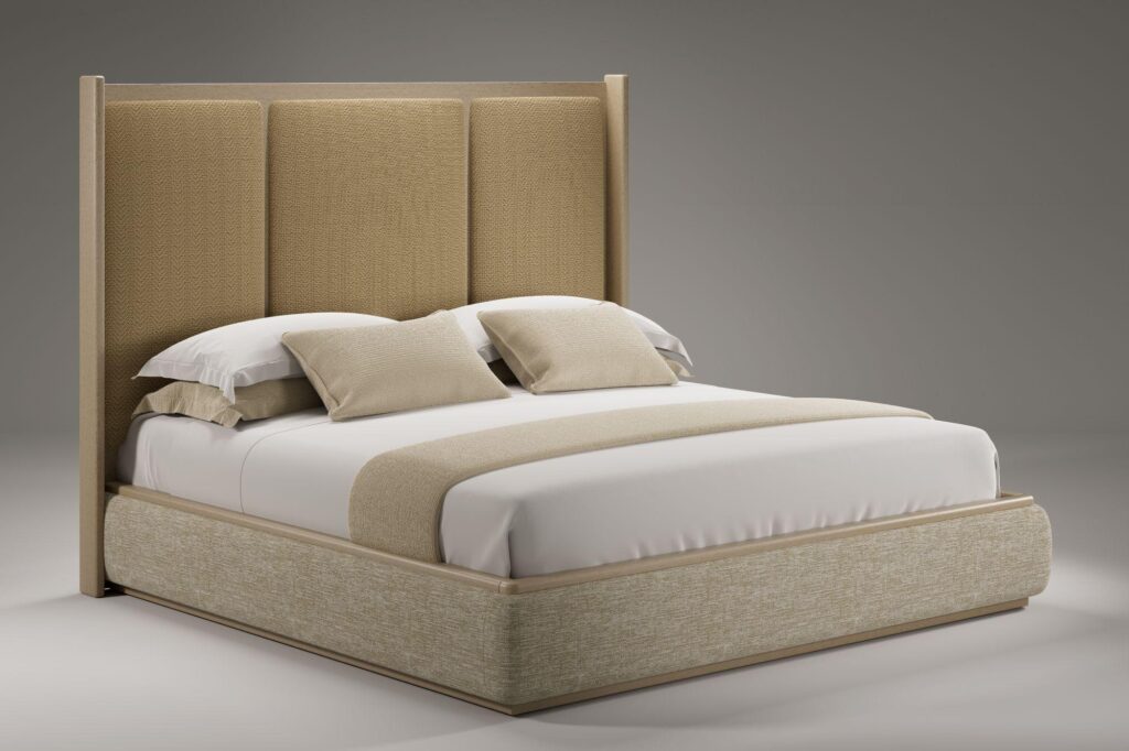 * The well-proportioned headboard of new Origen Bed is customizable with wood finishes, as well as fabric, textural raffia or quilted leather upholstery options.