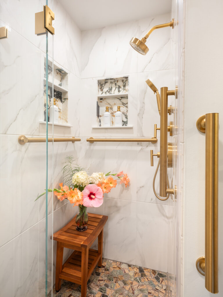 “The primary bathroom required the most dramatic transformation. It had become a space of vigilance rather than restoration,” she says. “Through thoughtful spatial planning, improved lighting, material selection and safety integration, we reshaped it into an environment that supports dignity, safety and nervous system calm.”