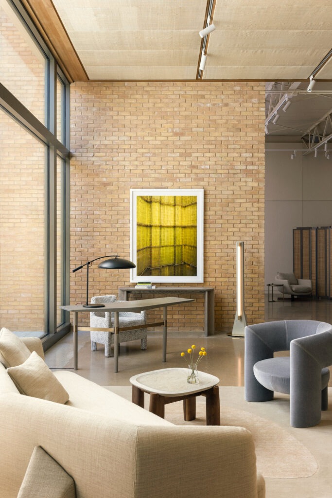 Inspired by Donald Judd’s industrial-to-residential conversions and  the revered architecture of the Kimbell Museum by Louis Kahn, BxSM  designed the space with an emphasis on abundant natural daylight  and Texas brick. The central courtyard, an unexpected focal point, is  surrounded by brick walls that diffuse sunlight throughout the space,  creating a serene yet dramatic interplay of light and shadow. The design  balances openness and intimacy, with strategically placed brick volumes  shaping the showroom layout while maintaining an inviting flow.
