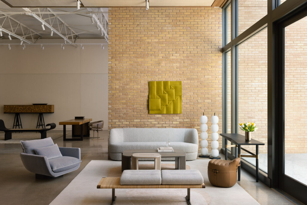 Initially an unremarkable warehouse with concrete block walls, BxSM  was tasked to create a distinct showroom experience while offering  a fresh interpretation of design and materiality. Unlike the loft-style  apartment setting in New York or the residential townhouse experience  in Toronto, the Dallas showroom emphasizes strong materials, natural  light, and openness—qualities deeply embedded in the Texas landscape.