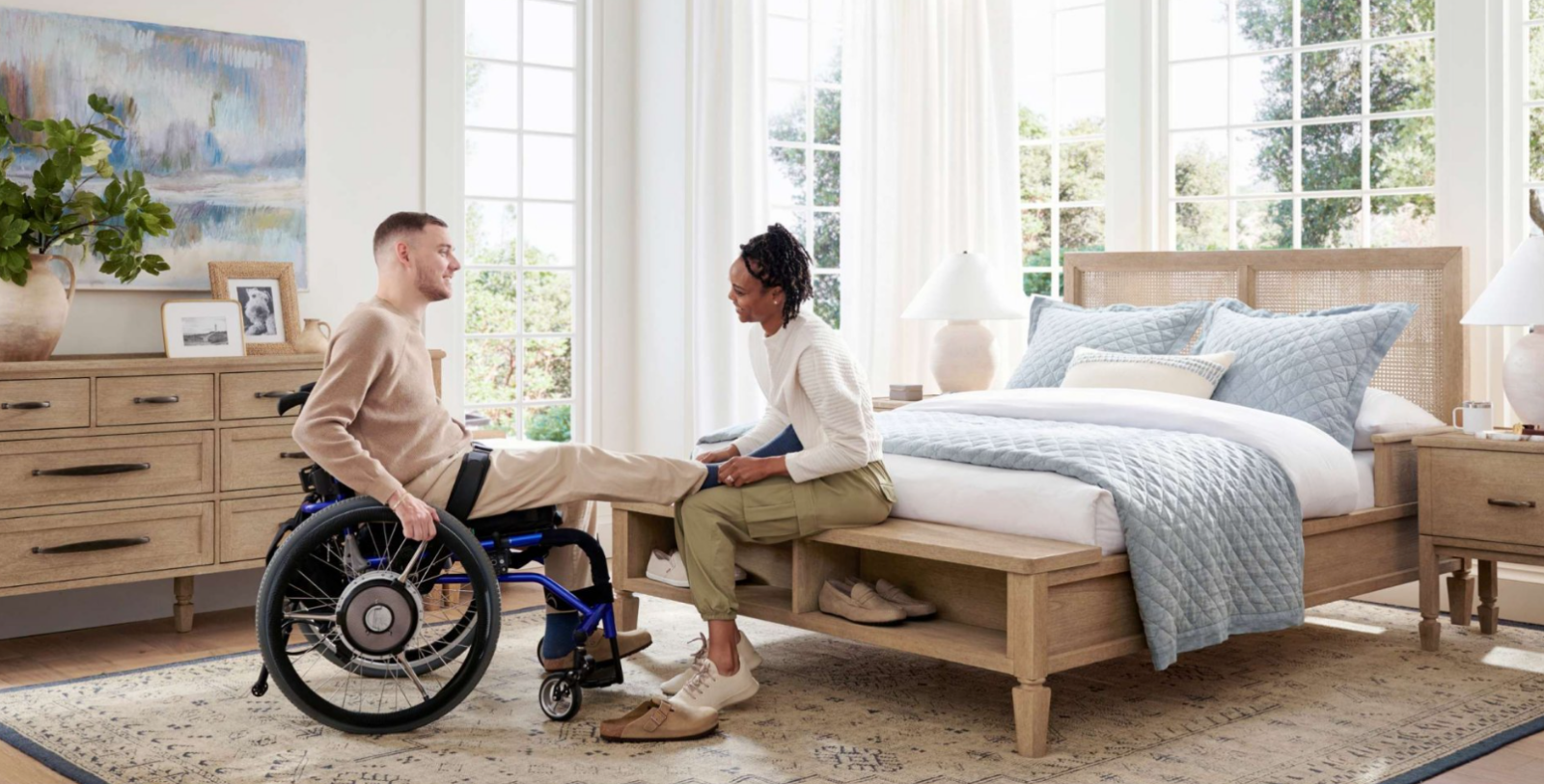 With a focus on the bedroom, the line adapts three popular Pottery Barn collections with features like armrests and grips on bedframes and chairs that make it easier to get up. A built-in bench on bedframes offers safe storage and gives people a place to sit when getting dressed. Nightstands have extra storage for items such as CPAP machines and a built-in electrical outlet to keep cords wrangled. Dressers have grab bars to allow people to move around more easily and extra clearance at the bottom for wheelchairs. Both nightstands and dressers have large, easy-grip handles.