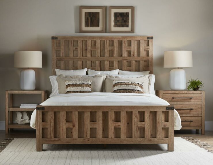 Influenced by Spanish missions, quaint bungalows and local architecture, Vineyard Row seamlessly blends earthy elements with sophisticated design. Details including high-low veneer planking, rustic hammered metal bar hardware, metal stretchers and seeded glass add to its authentic style.