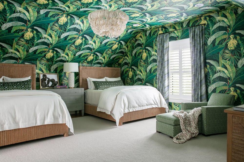 Liberal use of an overscale wallpaper pattern adds impact to a bedroom, part of a Seaside Sanctuary project on Sullivan’s Island, South Carolina.