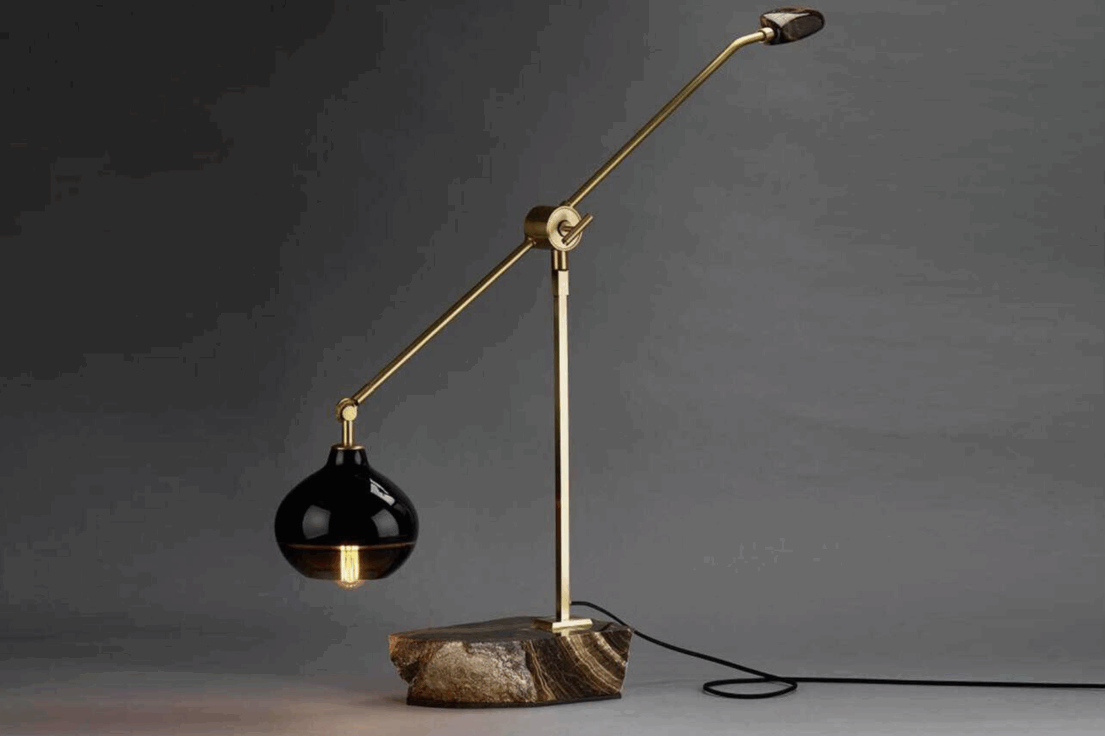 The Matsuri Studio Lamp with Indian Black Agate Base is a one-of-a-kind design by Joseph Pagano, combining mouth-blown glass globes with hand-finished stone, wood and bronze elements crafted in his New York studio. Finished and assembled by hand, it features a 40-watt carbon filament bulb for a warm, vintage glow. Pagano’s unique creations, including similar bespoke lighting, are available through Una Malan.