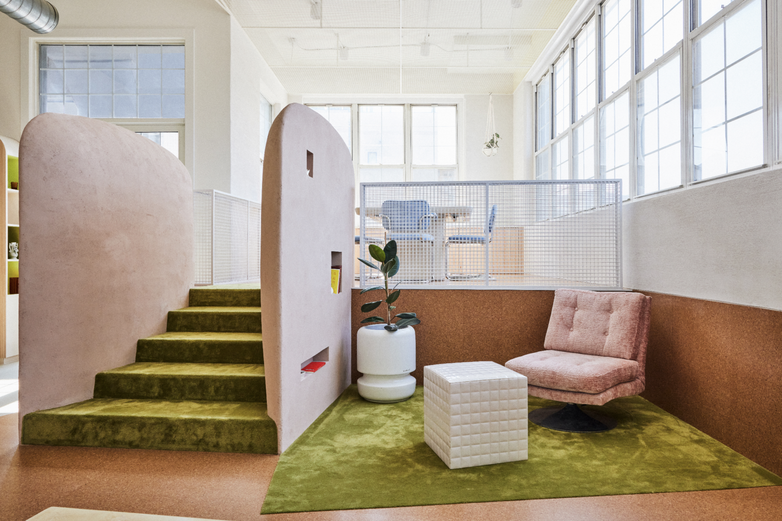 DNN: The project focused on referencing the existing palette of the industrial factory space while introducing color and texture. Could you provide insights into the thought process behind the selection of specific colors and textures, and how they contribute to the narrative of the space?