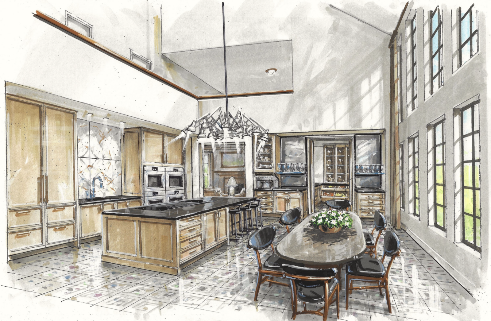 An expansive island of natural-hewn wood holds gas and induction burners, a griddle, and wok induction and the countertops shine in Artistic Tile’s Calacatta Rosa. Hanging from the vaulted ceiling overhead, a large custom-designed industrial-style chandelier provides adjustable light for cooking.