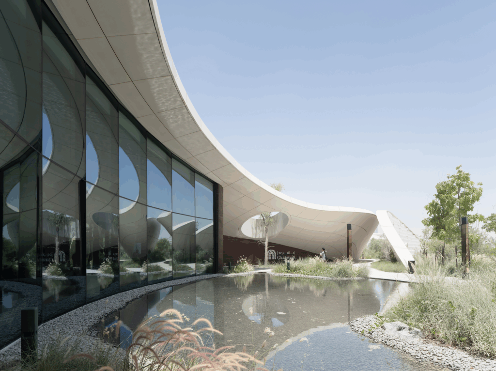 Every aspect of the building considers UAE’s climate conditions. Extended eaves shade the façade, reducing solar gain and improving energy efficiency. The southern water feature contributes to passive cooling by lowering the immediate microclimate. The surrounding forest ecosystem, designed with native and adaptive species, contributes to cooler ambient temperatures across the community compared to the adjacent desert zone, proving how ecological design can directly enhance urban comfort.