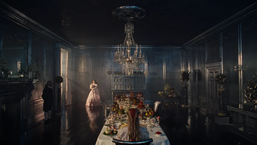 On Wuthering Heights: Fashion outlets like ELLE and InStyle describe the wardrobe as a “high‑fashion fever dream,” where silhouettes nod to Georgian and Victorian dress but fabrics, finishes and styling are brazenly modern. Production designer Suzie Davies describes building Wuthering Heights on a slight rake, with integrated rain rigs, real fireplaces and a crack in the façade that slowly sprouts arachnid‑like growths, so the house itself seems to rot and be reclaimed by nature. Love it or hate it, the through-line is clear: more-is-more is in.