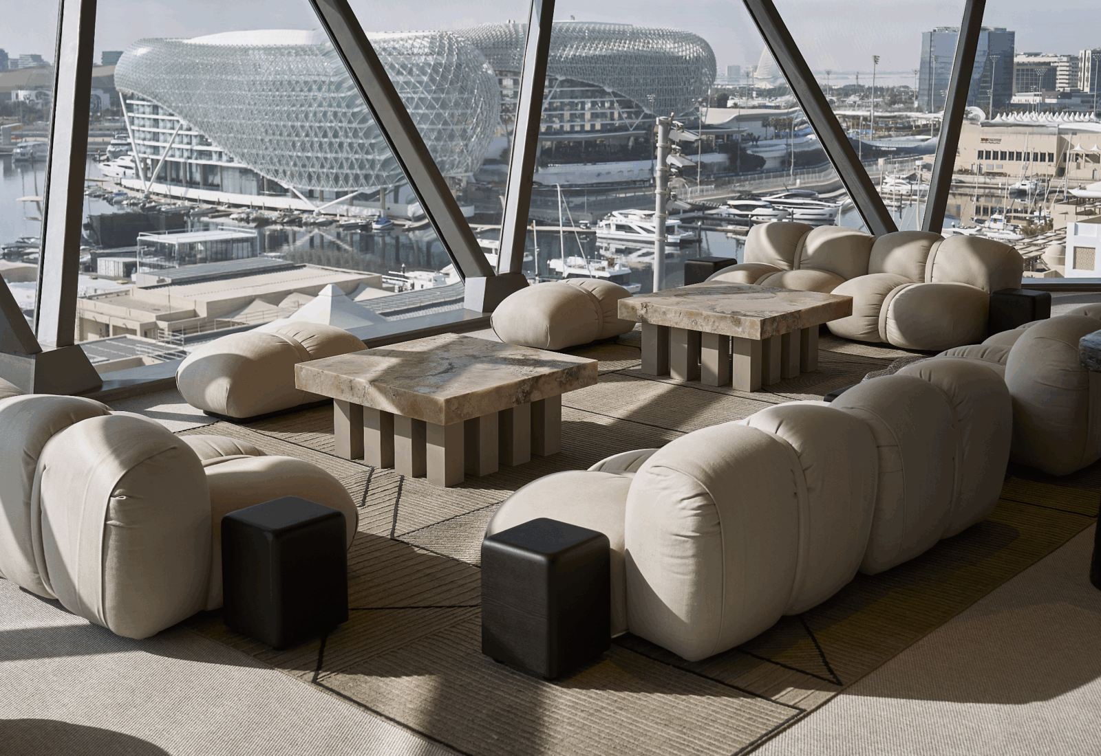 Dubai, United Arab Emirates, Sept 2025 – The narrowing cylinder of the Shams Tower, positioned at the axis of the finishing line, is reserved for the most important guests of the event. The viewing lounge splits between two indoor floors, crowned with a panoramic terrace shaded by a tented structure. Though all levels boast 360-degree views along the tower’s oval footprint, the prime position faces the finishing line of the Yas Marina circuit.