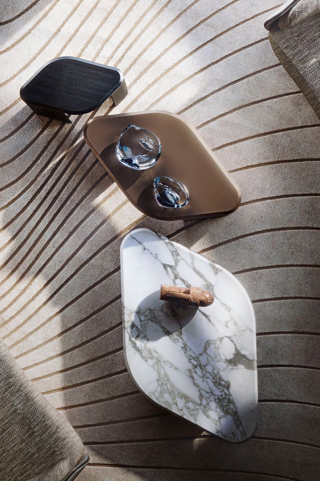 Their leather shells, joined in a dynamic and refined gesture, recall the wraparound profile of Maserati car seats. Next to it, the silhouettes of Teti coffee tables, ottomans and storage units interact with the set of three Ligea coffee tables, in a game of volumes.