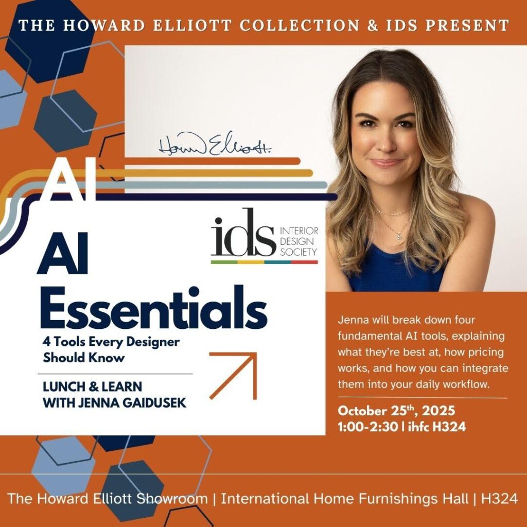 Howard Elliott, in partnership with IDS and Jenna Gaidusek of AI for Interior Designers, will be hosting a Lunch & Learn at the upcoming High Point Market. The session, “AI Essentials: 4 Tools Every Designer Should Know,” will take place on Saturday, October 25th from 1:00–2:30 PM in the Howard Elliot showroom at IHFC Hamilton Wing, Space 324.