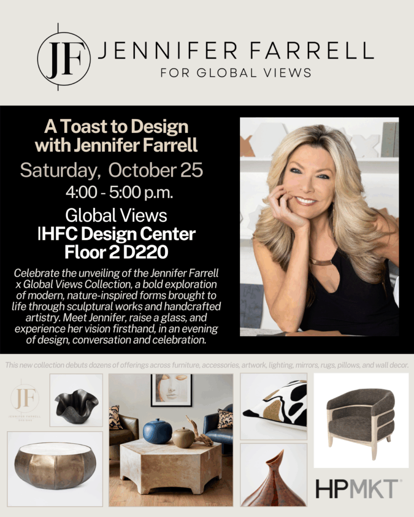 Celebrate the unveiling of the Jennifer Farrell for Global Views Collection at a special Meet & Greet event. Market attendees, industry supporters, and friends are invited to experience the collaborative vision firsthand, to meet with Jennifer while raising a glass and discovering the inspiration behind the collection. The event will include a short talk presented by Jennifer, followed by drinks and hors d’oeuvres, conversation, and celebration.