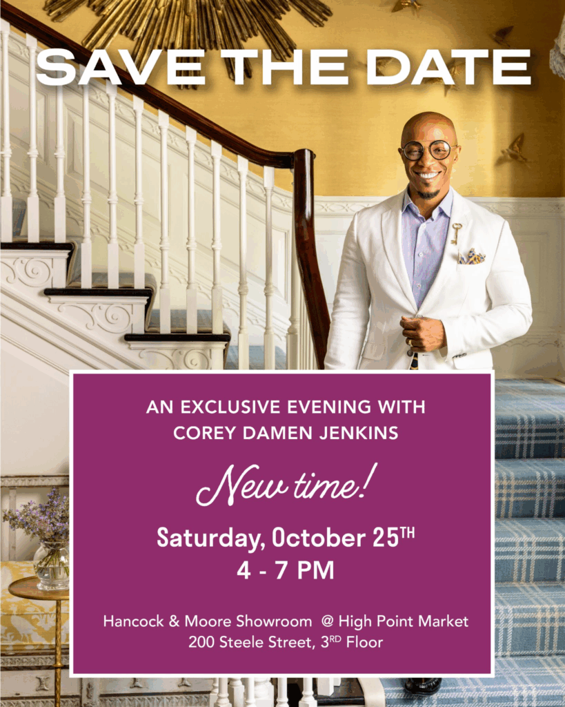 Corey Damen Jenkins is launching a new collection with Hancock & Moore and celebrating the grand opening of his Pied-à-terre in their showroom. There’s a special event on October 25th from 4-7pm featuring a public book signing for his new book, the launch of his YouTube series Design Reimagined, cocktails, hors d’oeuvres, and live musical performances.