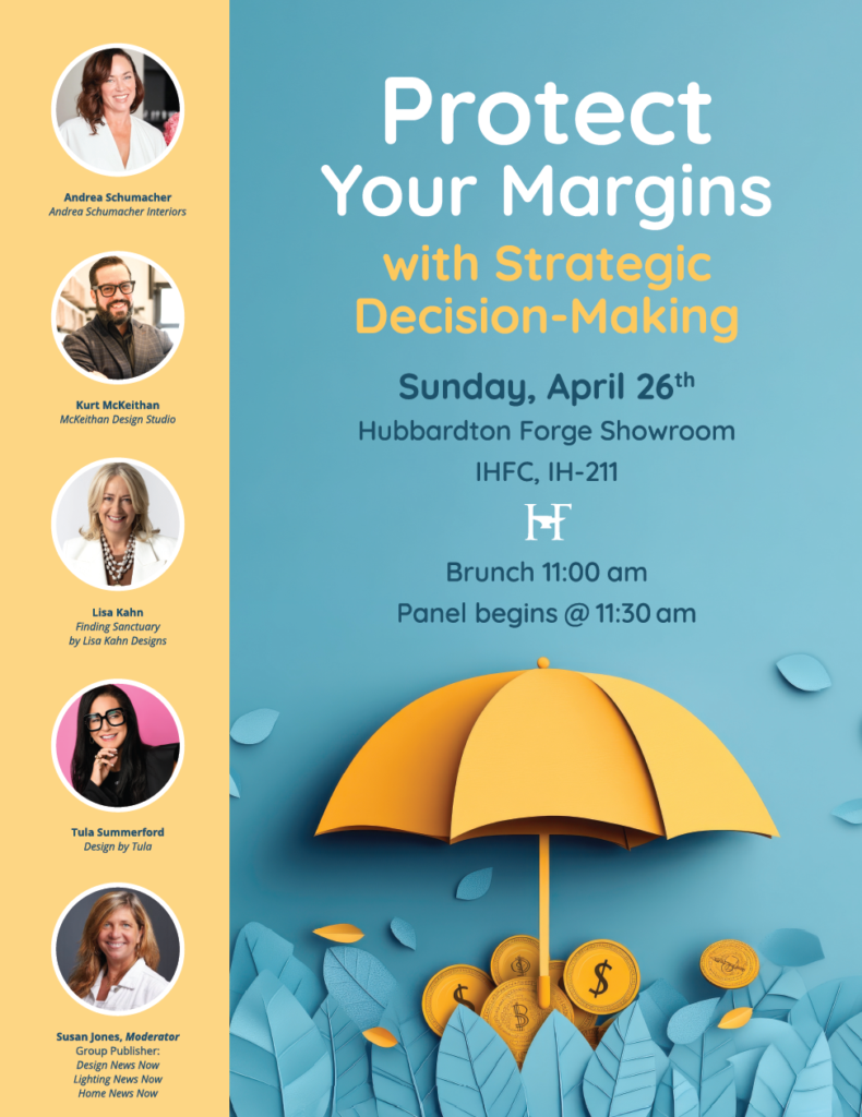 DNN EVENT – 11 am – Brunch and Panel: Protect Your Margins – Andrea Schumacher, Kurt McKeithan, Lisa Kahn, and Tula Summerford discuss gaining exceptional service from key vendors, navigating the pitfalls of online competition, and product customization to increase your margins. Moderated by Susan Jones, Group Publisher of Design News Now/Lighting News Now/Home News Now. Hubbardton Forge, IHFC, Commerce IH211