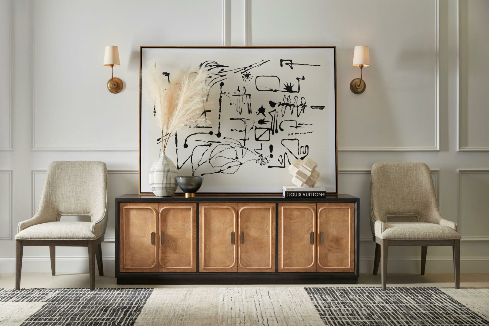 Entertainment Console: Part of the Urban design pillar, the Entertainment Console was designed to work in a variety of spaces and includes plenty of storage to handle all of life’s necessities. Crafted with ash and burl in a statement-making swirl veneer pattern on each of its six door fronts which are framed by a dark-tone case, the 72-inch console is completed with decorative hardware.