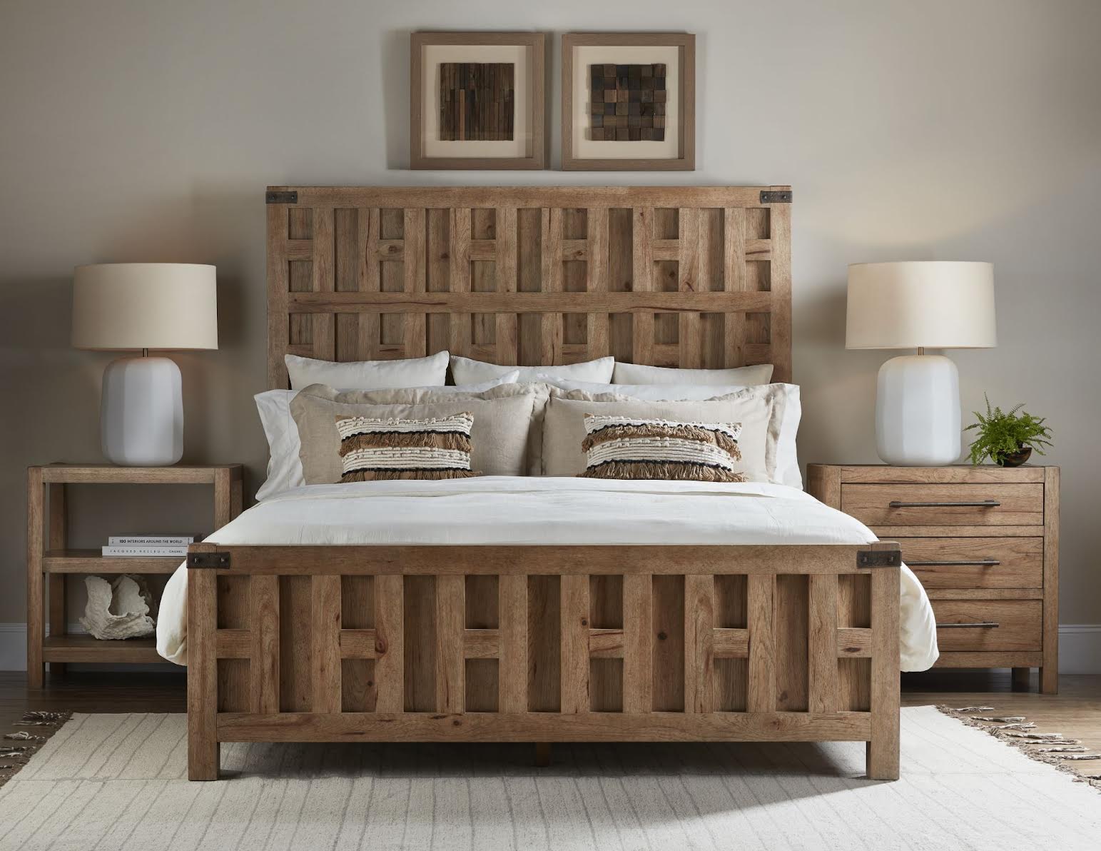 Additional highlights include a panel bed with geometric planking details on the headboard and footboard, reminiscent of an entry gate discovered in an area winery. A demilune nightstand, round dining table and console are each artfully inspired by wine barrels, while Adirondack-inspired accent chairs bring a casual outdoor vibe in.