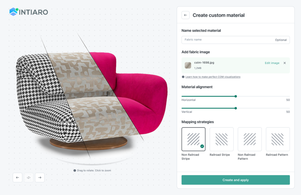 GREENSBORO, N.C. (October 21, 2024) – Industry-leading 3D technology provider Intiaro is launching a powerful 3D tool that makes it simple for custom furniture manufacturers to show any customer specified fabric on any furniture design, in real-time with no specialized 3D skills required.