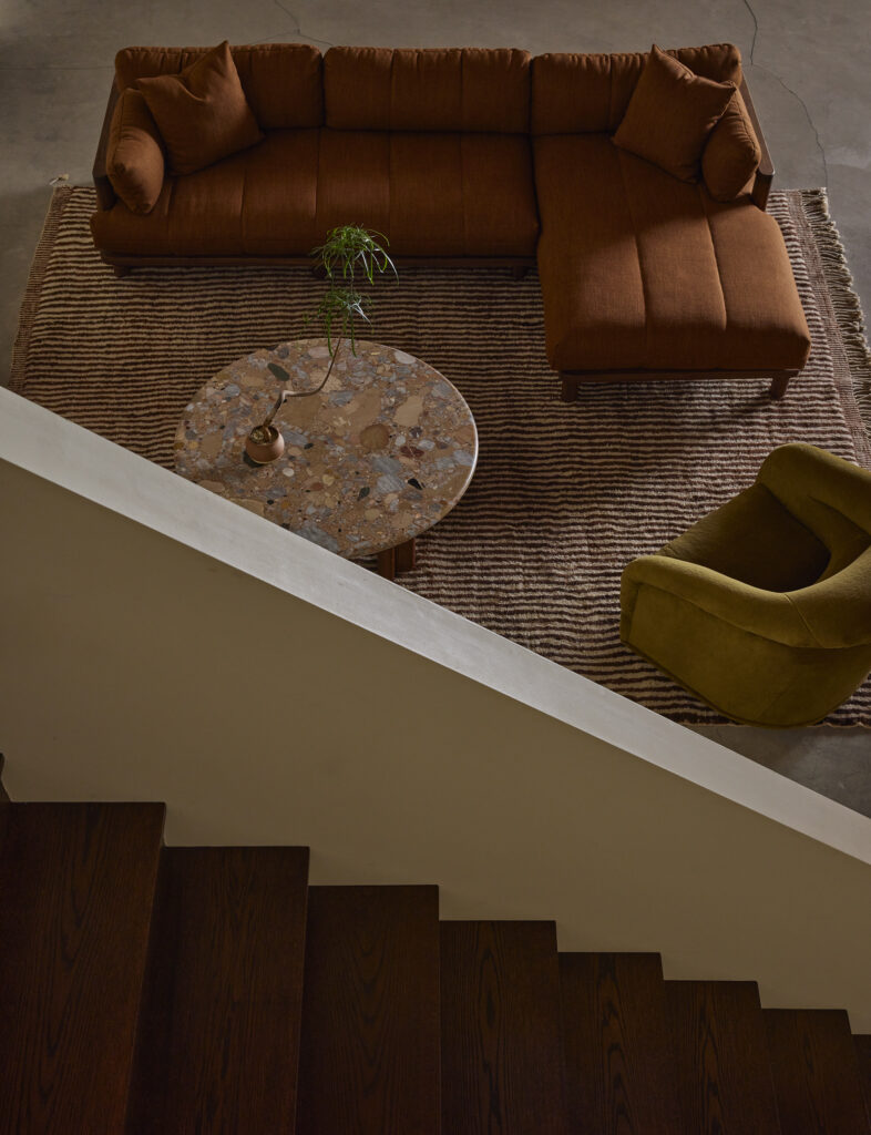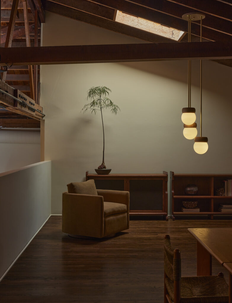 Inside Studio LF, visitors will find an airy, open main space with soaring ceilings designed to evoke a gallery-like environment. More intimate side rooms highlight lighting, vintage pieces and ceramics, and Lawson-Fenning’s growing fabric lines. An upstairs mezzanine provides space for designers to collaborate with clients, supported by a resource library stocked with material samples.