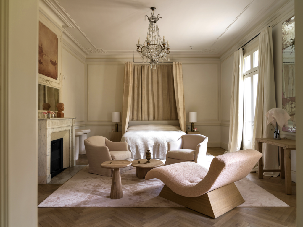La Banquière also marks the return of European artisan skills once confined to couture ateliers. Woven Belgian linens, hand-printed serigraphies from historic Lyon workshops, and block-printed Venetian fabrics join embroidered panels decorated with haute couture techniques. The project’s signature motif is a subtle bee rendered in the Pont de Beauvais stitch, which ties together the estate’s biodiversity, regenerative spirit, and circular design philosophy.