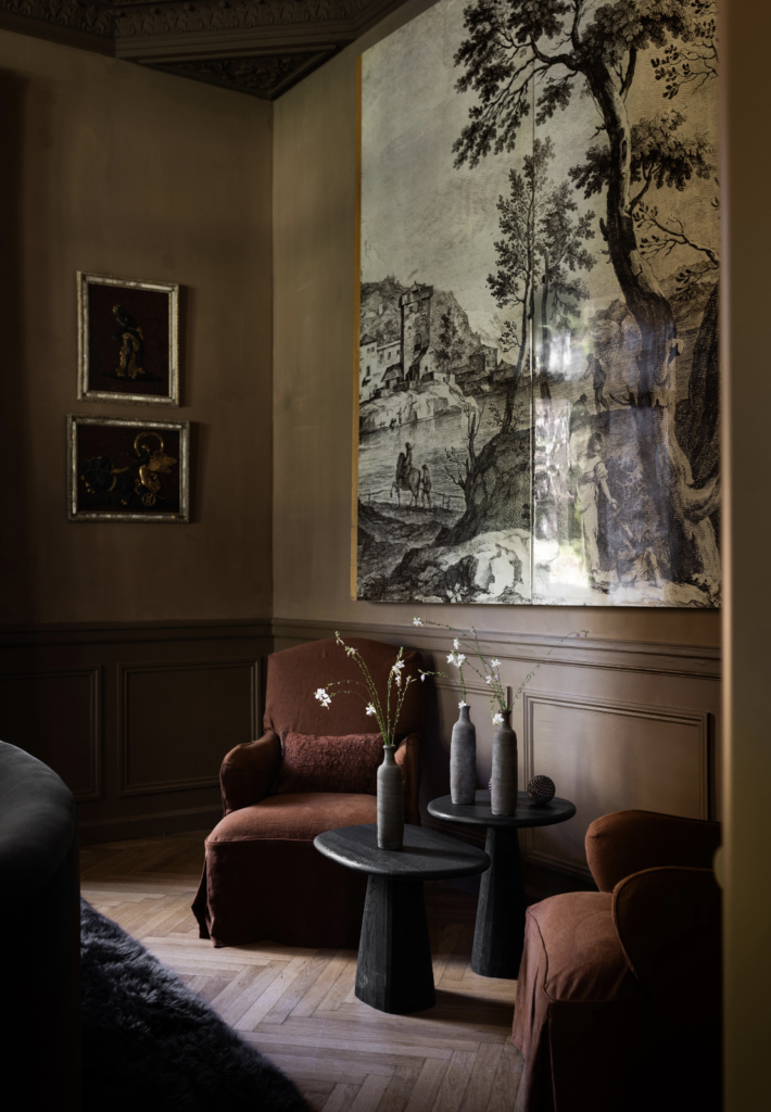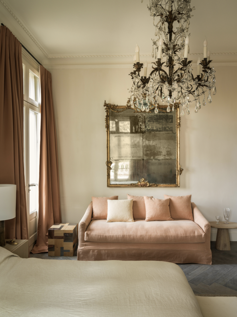 Alongside newly dyed linen, hemp, and cotton, the design incorporates a curated selection of antique fabrics – Provençal damasks, Venetian block-prints, and couture-surplus textiles, sourced through a long-established network of collectors and dealers. In many rooms, antique textiles served as the starting point: once discovered, their unique texture, patina, or pattern helped define the entire design direction. In others, naturally dyed linen or hemp sets the tone, imbued with subtle variations, depth, and a quiet, living luminosity.