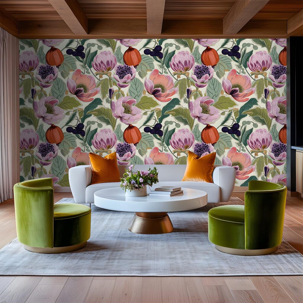 As seen on HGTV, Margo Fruit Floral Wallpaper is a standout large-scale design. Featuring oversized blooms and playful fruit in vivid color, it brings exuberance to any space. It’s available in peel & stick, pre-pasted, and traditional paper and made in the USA.