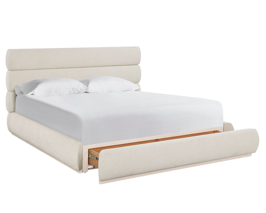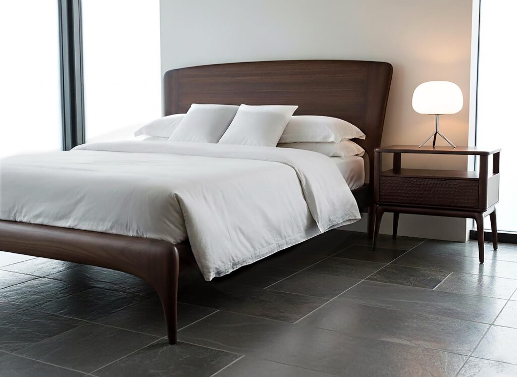 The AH ORIGEN BED marries clean lines and tactile details. A well-proportioned headboard with an exposed frame is customizable with wood finishes and upholstery fabric, textural raffia, or quilted leather.