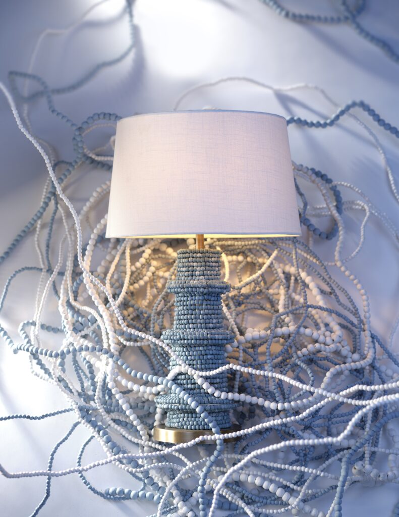 Jamie Young’s Rowan table and floor lamps feature hand-carved mango wood beads finished in a soft cream tone and carefully strung on metal wire to create a refined yet playful base. Each bead reflects the natural variations of the wood, resulting in subtle differences in color, size, and texture that give every lamp a distinct character. The design offers a relaxed, contemporary way to bring warmth and style to any space.