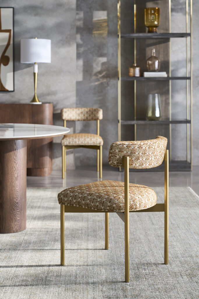 The Coley Side Chair features rounded metal posts and a floating seat design. Stocked in a black nickel finish, with brushed brass also available. It’s customizable in fabric or leather for a refined dining statement.