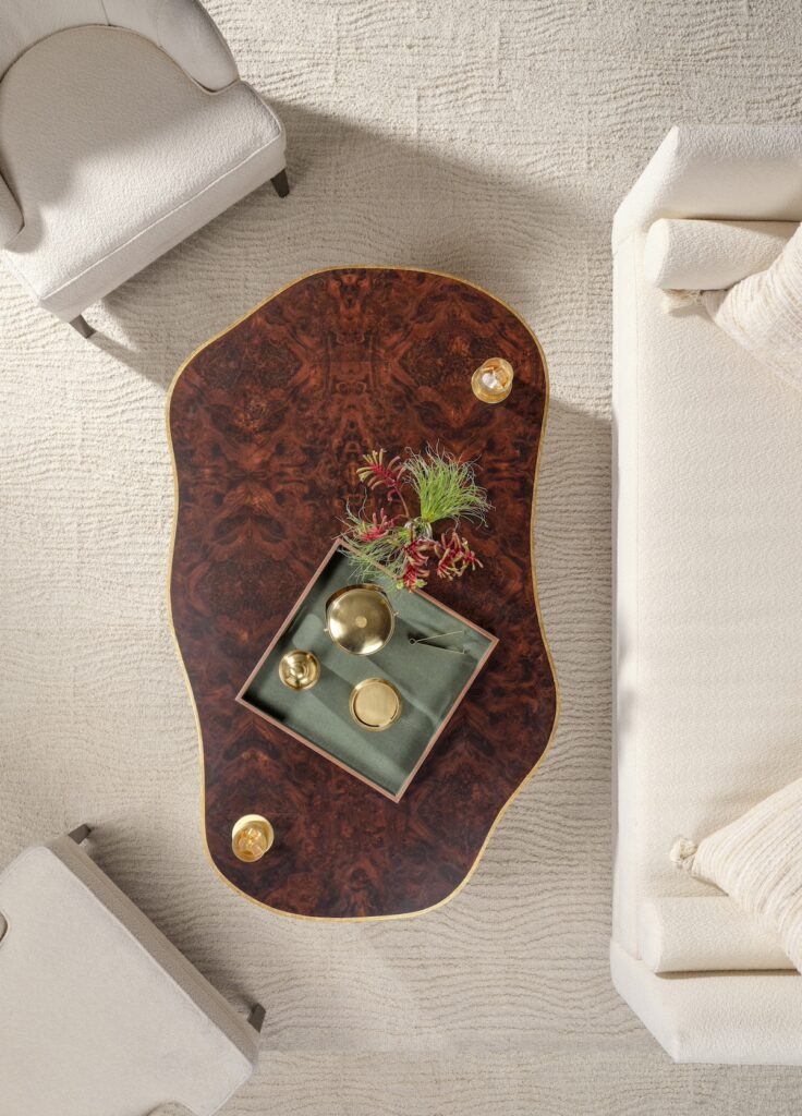 Page Coffee Table’s abstract shape is highlighted by the bold patterning of its olive ash burl wood veneer. Faux-raffia textured gold trim along the table’s edge blends in with the design but brings a bit of muted glam to its otherwise organic look. Each table will be entirely unique-a natural work of art.