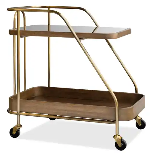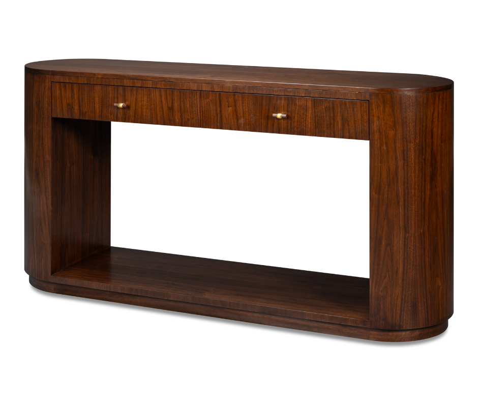 Highlights include the Romano Writing Desk with a drop-front keyboard drawer and metal stretcher, and the Walnut & Wine Bar Cart in figured walnut with smoked glass and a satin-brass frame.