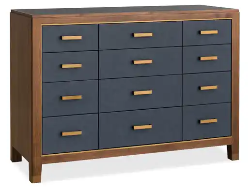 The Melange Geneva Accent Drawer Chest stands out with navy top-grain leather, custom hardware, and metal detailing — an elegant blend of texture and sophistication.