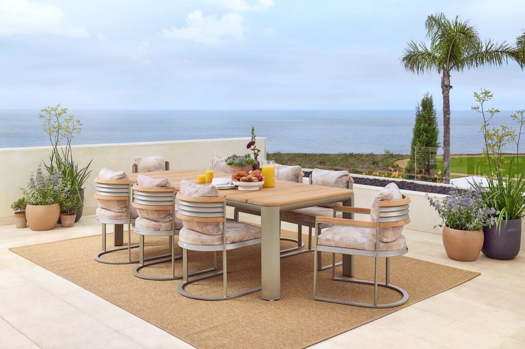 Celebrating 80 years of design leadership, Brown Jordan proudly introduces the Solenne Collection. With its signature parallel slats inspired by sun-filtering screens and modernist facades, fluid curves, and a 360° design—meaning no visual “back”—Solenne is designed to anchor a space from every angle. Crafted from warm teak and powder-coated aluminum, this vast collection features dining, lounge, and swivel chairs, a chaise, ottoman, sofa, bar and counter stools, and teak dining tables, each piece striking a balance between enduring comfort and architectural beauty.