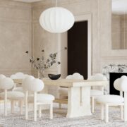 Jamie Young’s Rowan table and floor lamps feature hand-carved mango wood beads finished in a soft cream tone and carefully strung on metal wire to create a refined yet playful base. Each bead reflects the natural variations of the wood, resulting in subtle differences in color, size, and texture that give every lamp a distinct character. The design offers a relaxed, contemporary way to bring warmth and style to any space.