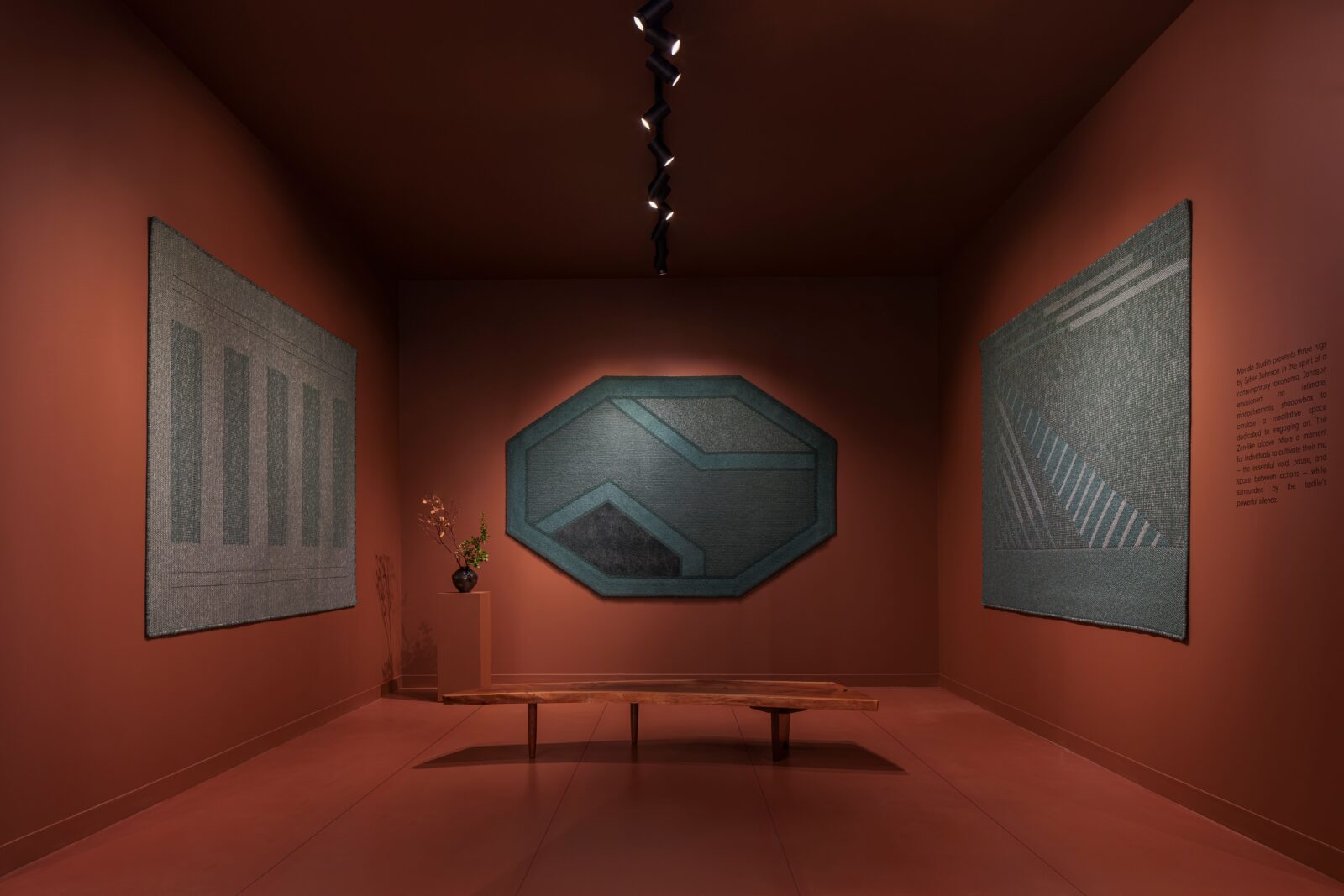 To create the serene, shadowed alcove, earth-toned walls, floor, and ceiling form the monochromatic shadowbox of the tokonoma. The pieces selected from Johnson’s series Atelier: Yarn Unveiled embody the artist’s deep reverence for yarn. Accompanied by an “R” Bench by George Nakashima, a Tsuiki copperware vase, and an ikebana floral arrangement, her works invite individuals to focus on a seemingly minimal curation. As the viewer slows their gaze in the quiet recesses of the booth, their attention falls deeper into the details of the work.