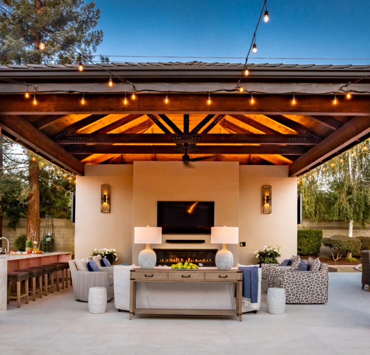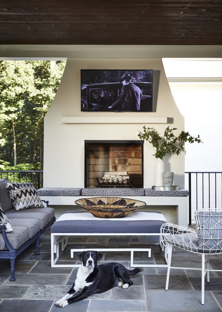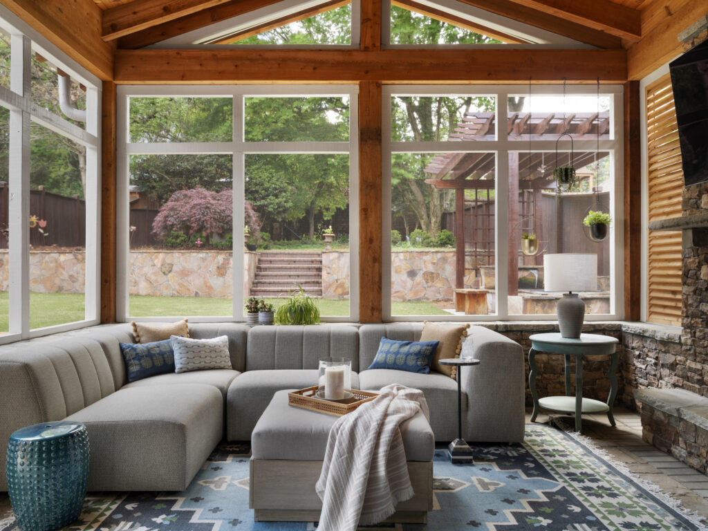 In Atlanta, Micaela Quinton, principal of Copper Sky Design + Remodel, is seeing the same demand from clients. “Homeowners want an indoor-meets-outdoor type of space,” she said. “They want to feel comfortable and cozy while also being able to connect to the sights, sounds, and feelings of nature.” Her screened-in porch project reflects that balance, utilizing pieces such as a tufted sofa, flatweave traditional rug, and thoughtful touches like the drinks table. Quinton further noted, “Incorporating the comforts of the indoors is key. Comfortable seating, an integrated TV, a ceiling fan to help air movement, and thoughtful lighting all combine to create a space that functions like a living room.”
