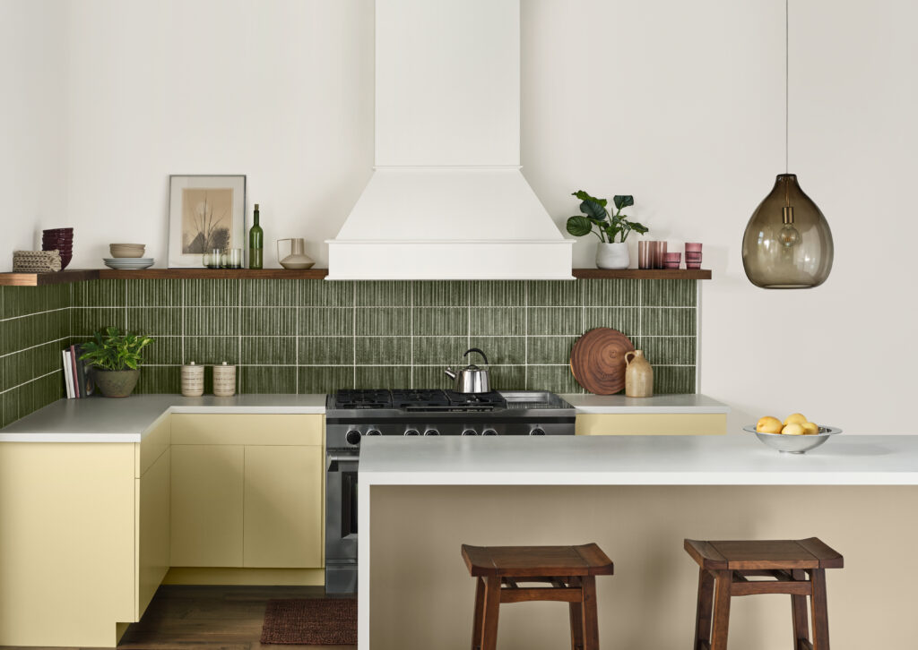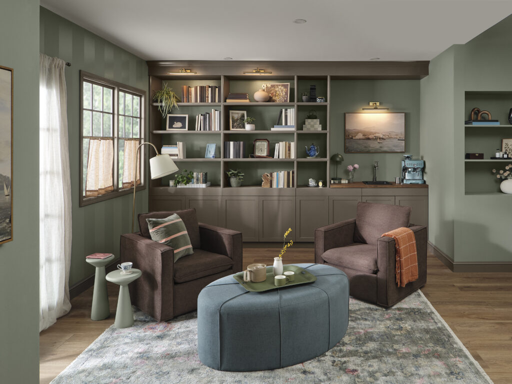 Valspar leaned into nostalgia with Warm Eucalyptus, a grounded green drawn from vintage palettes, evoking optimism and comfort through its timeless quality, that also feels playful when paired with bolder hues.