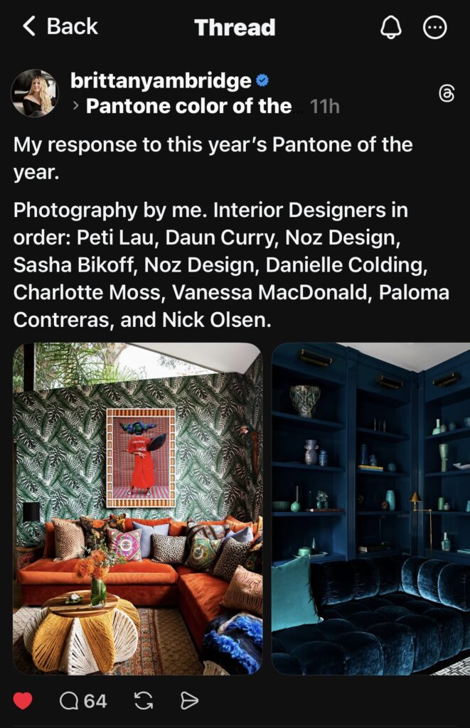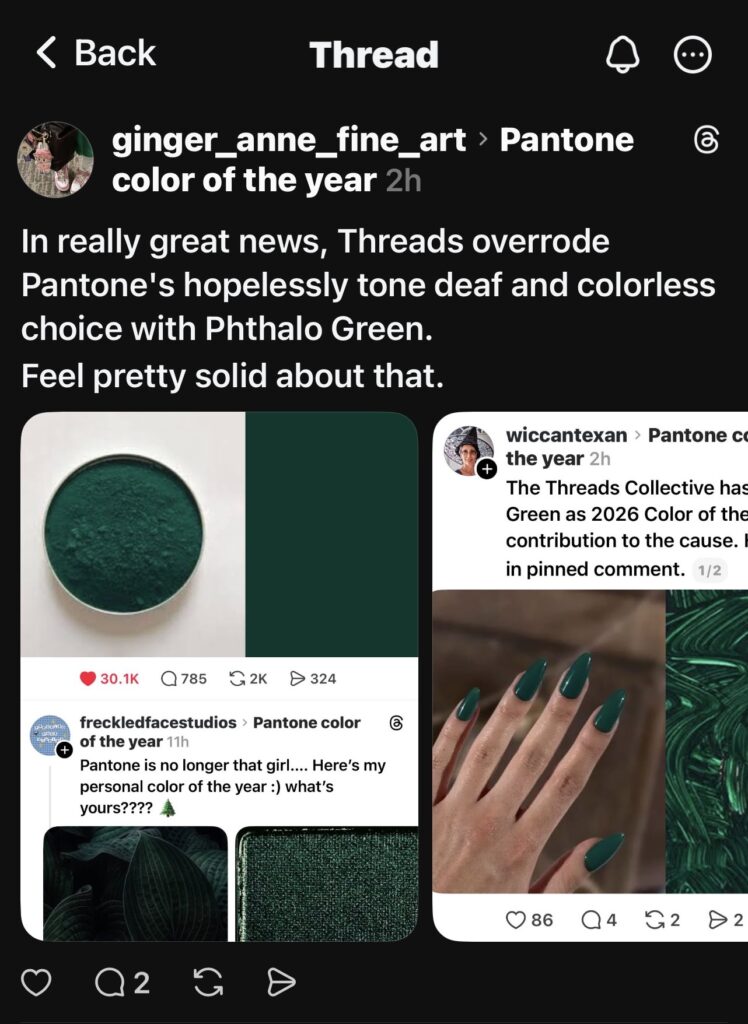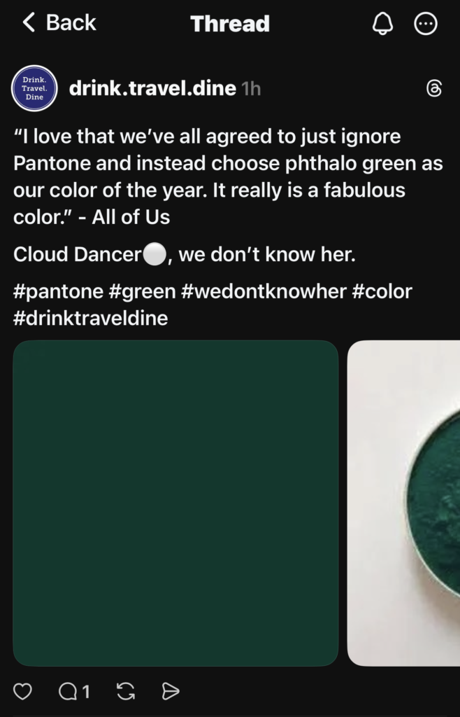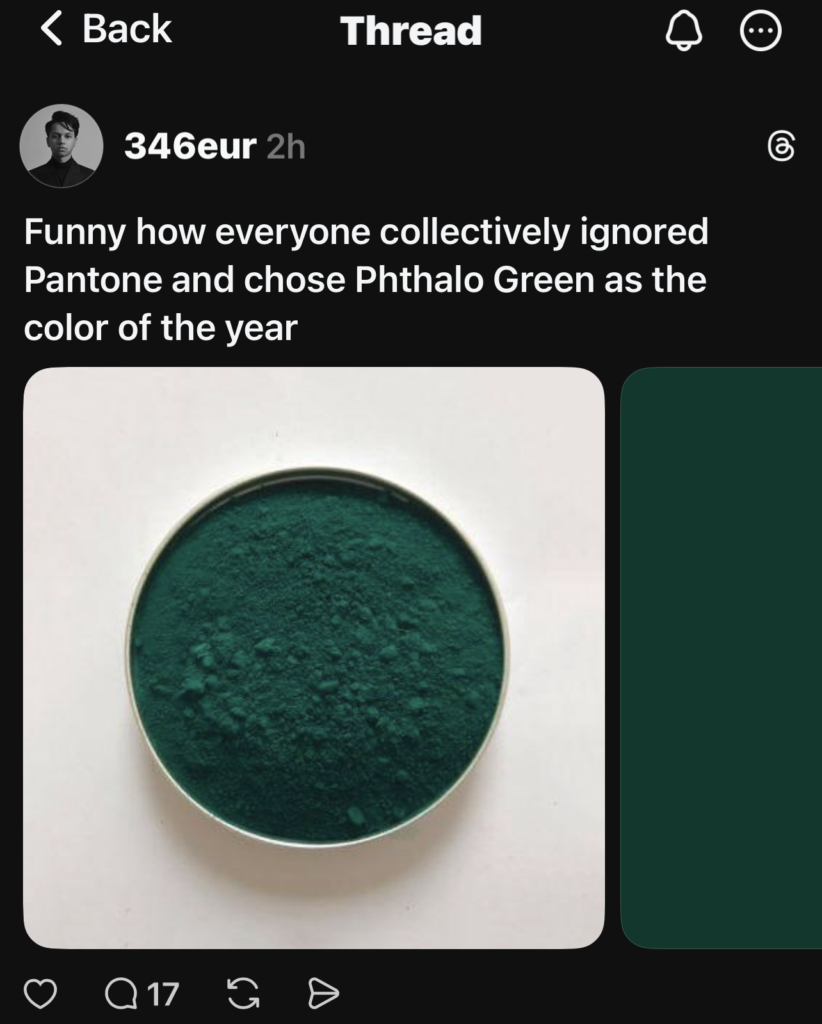 Threads-users (Threaders?) also praised trend prediction lab WGSN and Coloro for being closer to hitting the mark with their selection, Transformative Teal: