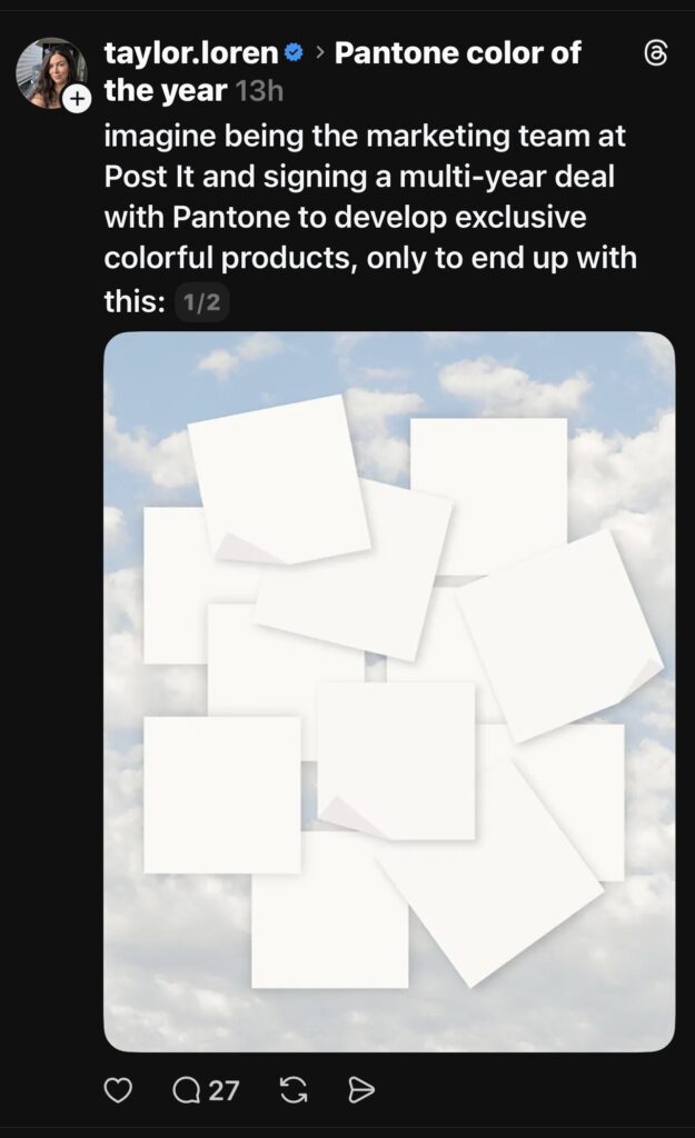 For fun, I’ll leave you with a few more pithy social media responses to Pantone’s color of the year, “Cloud Dreamer” from the extremely online. And until next time, everyone should go outside and touch grass — Phthalo Green grass, if you will: