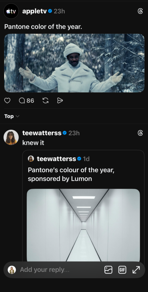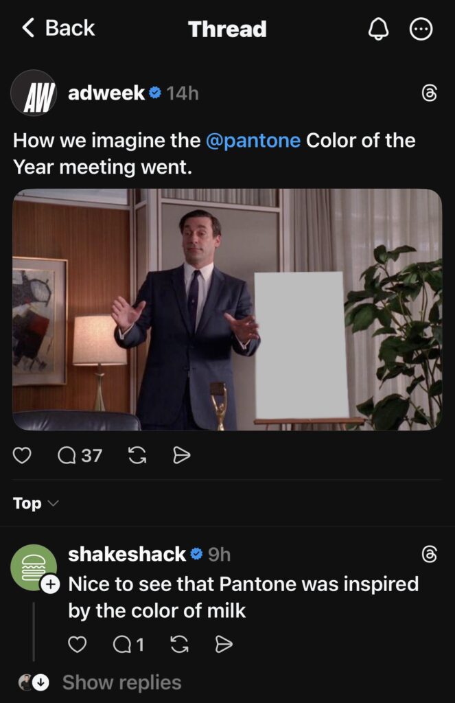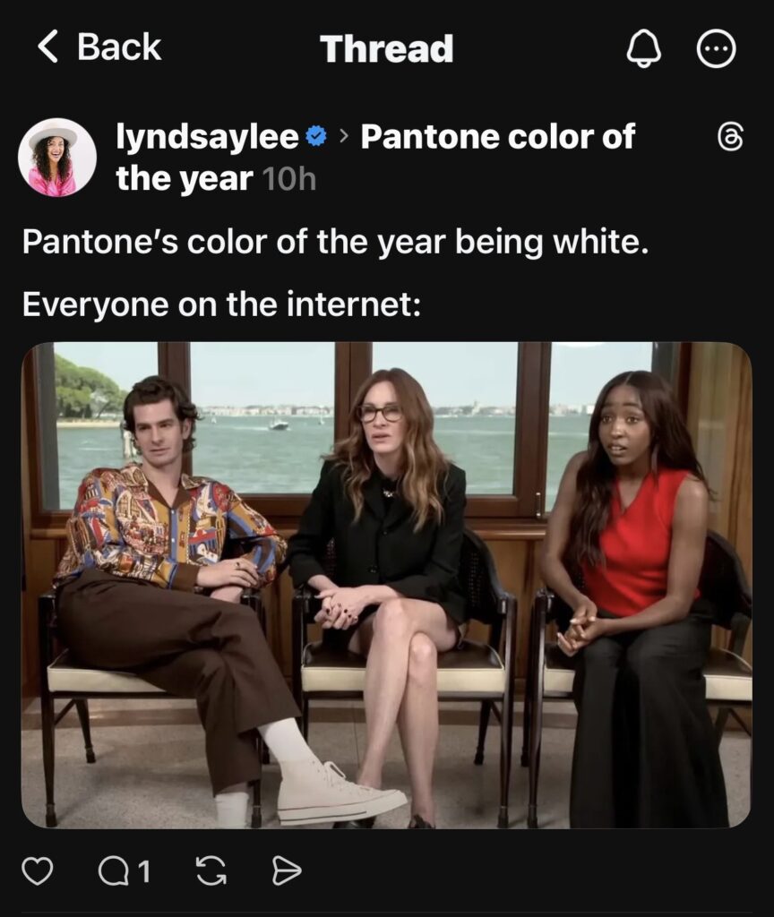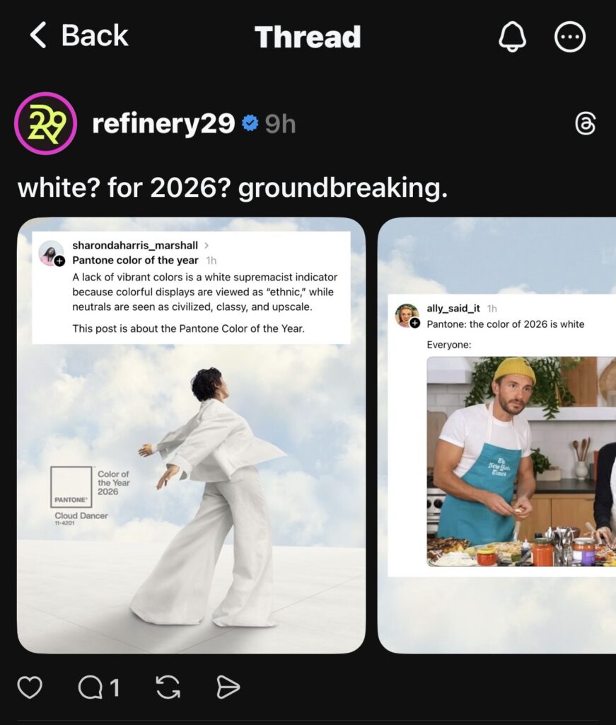 The case of Pantone’s COTY differs, however, in that they are not one brand selling product. Sure, they’ve monotized themselves with COTY merch, but their primary reason for existing is to aid other brands seeking their data and insights. To that end, the decision to name a shade of white the color of the year, the reflection of all the colors, is a blank canvas to project oneself onto. The degree to which one cares about or has an opinion on the color of the year, much like the Sydney Sweeney “Good Genes/Jeans” ad, is a fairly clear indicator of their politics and of the cultural milieu in which they swim.