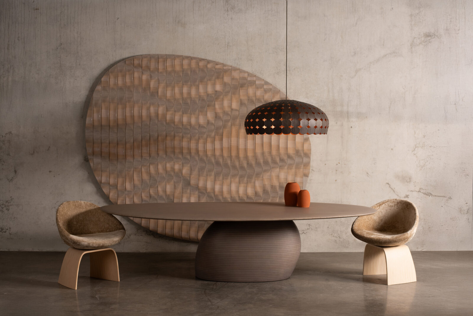 Lighting plays a central role through two new collections. The Majo Lamps feature perforated surfaces that allow light to pass rhythmically through matter, transforming illumination into texture and shadow. The Cartussia Lamps, with their enclosed forms recalling vaulted architectural spaces, produce indirect and contemplative illumination. Together, they reinforce the exhibition’s exploration of light as a carved, atmospheric element.