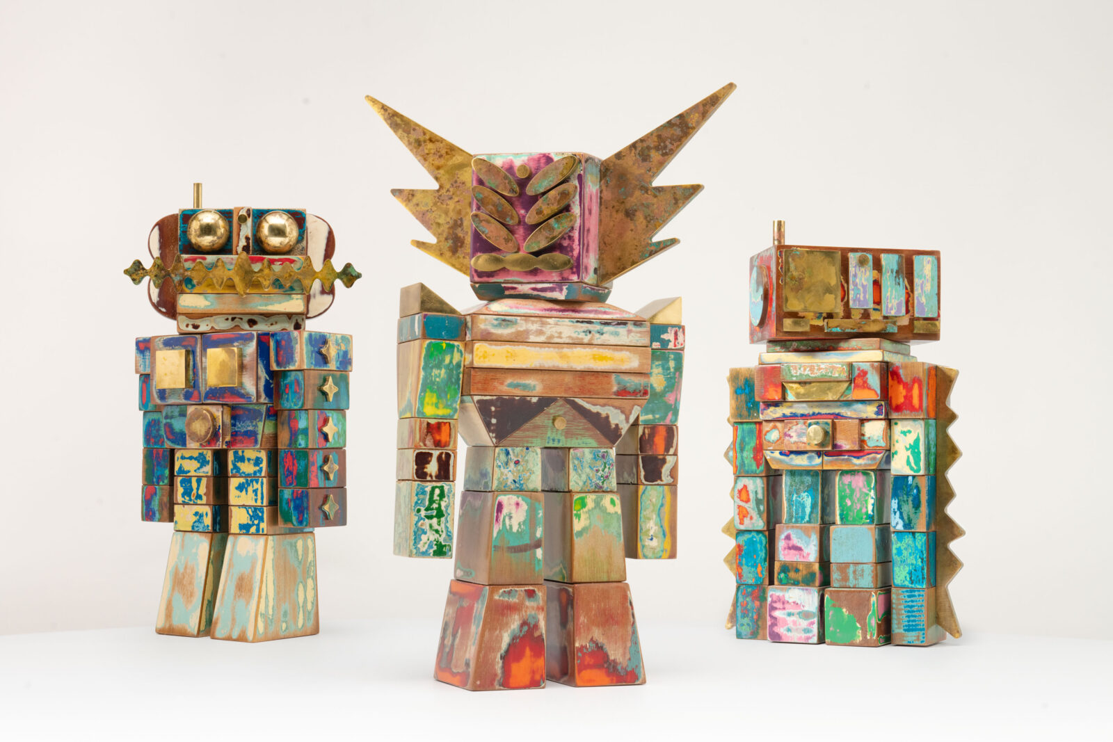Finally, each sculptural form includes aged brass which is chemically treated at Studio Reborn in Saigon. The brass is then coated to preserve the patina. These brass elements form the unique features of each character. Eyes, antennae, mouths and arms are embellished with metal.