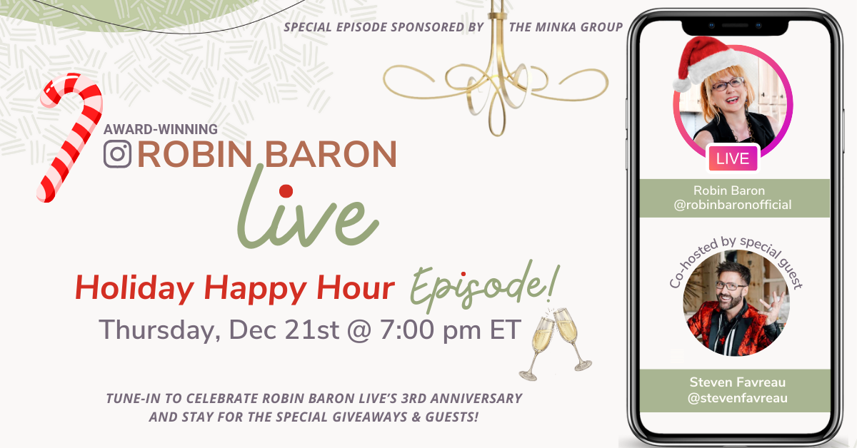 This end-of-year Holiday Happy Hour Celebration Episode will be held on Thursday, December 21st at 7 pm Eastern airing live on Instagram at @RobinBaronOfficial and will feature three exciting product giveaways in the form of fabulous chandeliers from Robin’s lighting collections with the Minka Group. This star-studded live show will also feature Robin’s bestie as co-host, award-winning interior designer, Steven Favreau, Founder of Favreaulous Factory and Favreau Design. Together, Robin and Steven will welcome an incredible line-up of guests and industry professionals, who have been featured on one of Robin Baron LIVE’s 150 + episodes over its 3-year run. As a special treat, audience members will have several opportunities throughout the episode to win fabulous lighting fixtures!