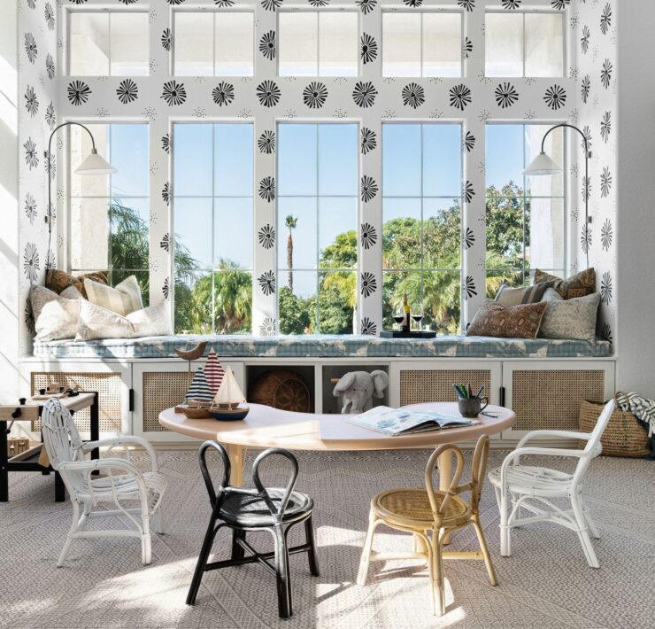 The collection, comprising four wallcoverings, six fabrics, and one tasseled trim in a total of 22 SKUs, is unified by Ortiz’s signature motif, the palm tree. The line weaves in the spirit of Ortiz’s Latin culture in each design, an homage to her deep connection to her home country’s biodiversity and heritage. Her tropical upbringing is underscored further by the collection’s wide range of natural materials, including linen, sisal, and raffia.