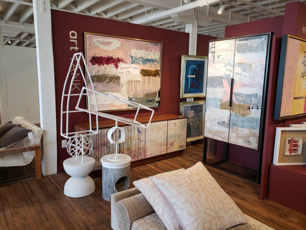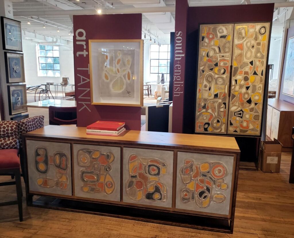 In its 500-square-foot showroom at 313 Space, Art Tank by South + English is displaying several cabinets, a desk, a dining table and 30-40 paintings. Smith’s paintings generally range in price from $2,600 to $10,990; Ebbetts’ range from $1,100 to $10,500.