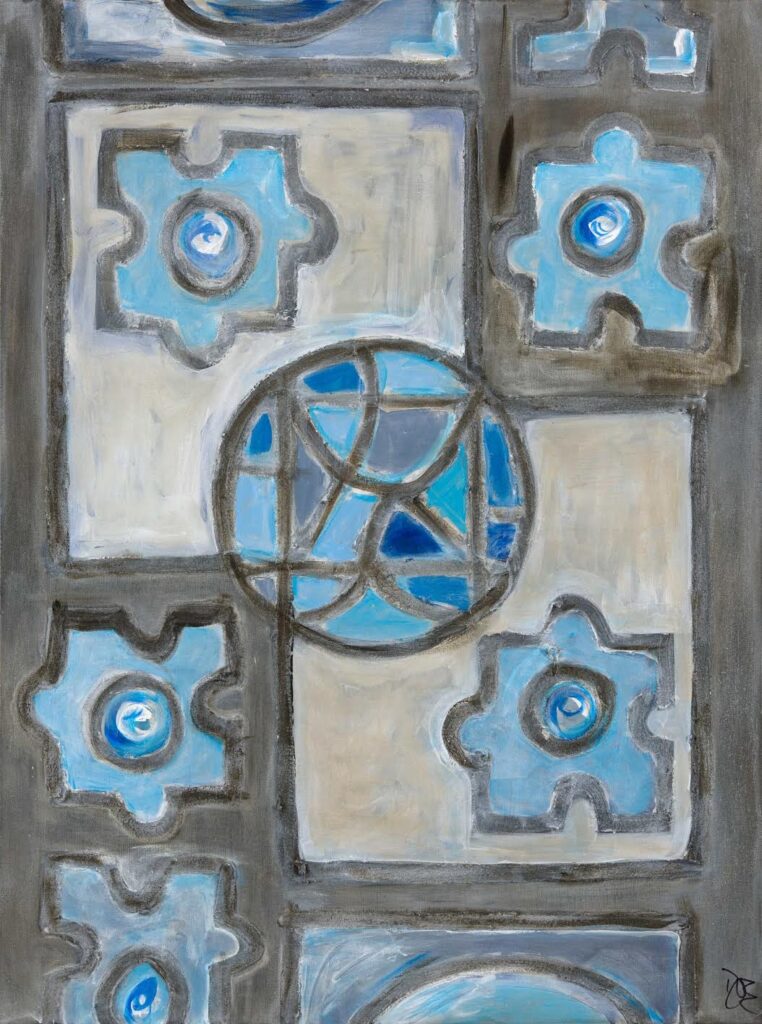 His geometry-inspired work celebrates shape, pattern, color and texture, combining fabric, plaster, paint and other materials on canvas.