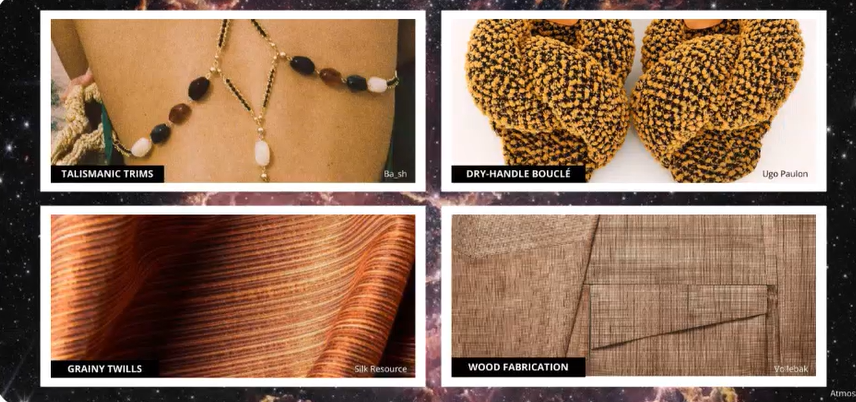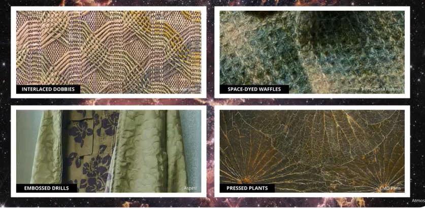 Key features: Talismanic trims, grainy twills, dry-handle boucle, wood fabrication looks, vitalizing sheers, interlaced dobbies, looped fringing, embossed drills, spaced-dyed waffles and pressed plant motifs.