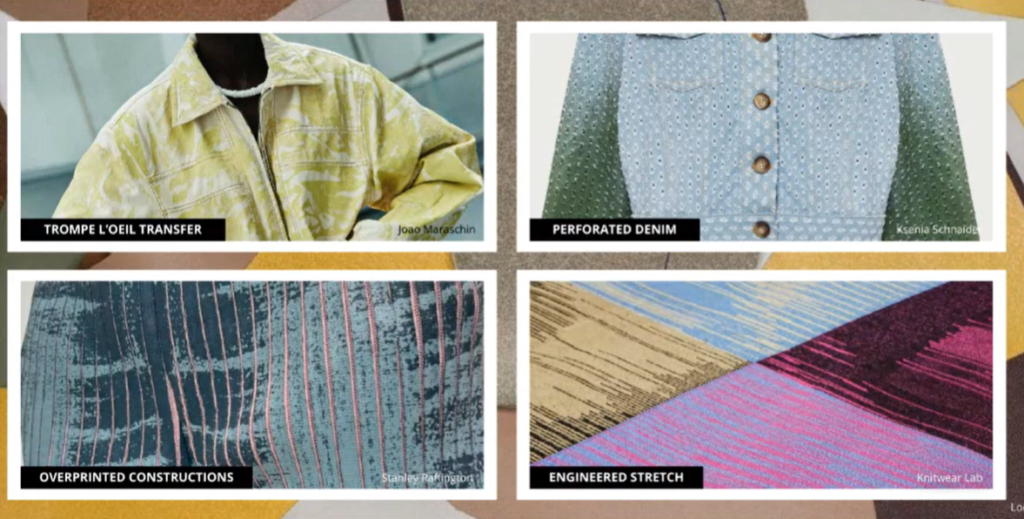 Key features: Striated active jersey, velvet staples, dopamine batiste, color clouding, trompe l’oeil transfer, overpainted constructions, engineered stretch and perforated denim.