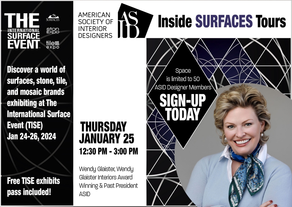 The partnership between TISE and ASID is created to increase show traffic and to introduce designers to experience The International Surface Event (TISE) like never before, by offering a special ASID Inside SURFACES Tour with a two-day events program that will deliver curated and guided tours where designers will visit the top surface, stone, tile, and mosaic brands exhibiting at TISE 2024.    ASID Inside Surfaces Tour is for (50) ASID designer members in good standing to sign up to participate in one of two curated and guided half-day tour options, either on the afternoon of Thursday, January 25th or the morning of Friday, January 26th. Tour participants will also receive a free three-day exhibit hall pass to the show, as well as access to educational events and gain access to an exclusive VIP Lounge for refreshment and group networking.